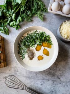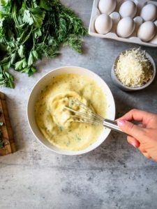 While the potatoes and onions are cooking, add 8 eggs with 1/4 cup of heavy cream, a pinch of salt and black pepper and 1/3 cup of finely chopped herbs, such as parsley, dill, rosemary, oregano or chives into a medium mixing bowl. Whisk until fully combined and frothy.