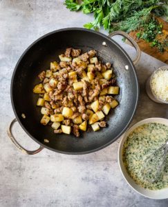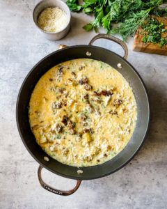 Pour the eggs, heavy cream and herb mixture over the potatoes, onions and italian sausage and then sprinkle with 4 ounces or about 1 cup of shredded mozzarella.