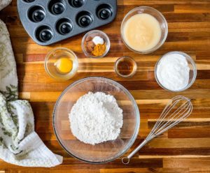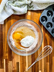 To make a batch of about 30 mini doughnuts, gather 1 large egg, 1/2 cup of plain full-fat Greek yogurt, 2/3 cup of plain organic apple sauce, 1 tablespoon of pure maple syrup or honey, 1 cup of whole wheat, oat or all purpose flour, 1 teaspoon of baking powder, 1 teaspoon of cinnamon and 1 teaspoon of turmeric.