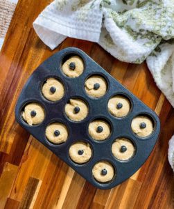 Lightly grease a mini doughnut pan (you could make mini muffins with this batter too!) and fill each cavity half way. The batter is thick, so I transferred it all into a sandwich bag, cut off the tip and piped it into the cavities. It is one extra step, but saves time and wasted batter in the end.