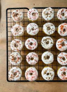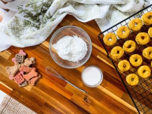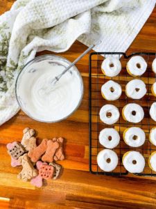 Dip the tops of each doughnut in the frosting and return them to the cooling rack. There will be enough frosting to glaze the entire doughnut if you want or double dip the tops. Once all of the doughnuts are glazed, crush up a few of your dogs favorite bones and sprinkle away…