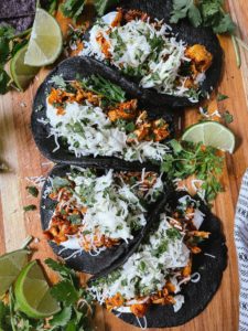 When it comes to fillings, anything goes! I love something bold in color and flavor, like this chicken tinga or some barbecue shrimp. Start with a little whipped avocado cream and then finish with some cilantro lime slaw and you will have some incredibly delicious and really quite gorgeous tacos.
