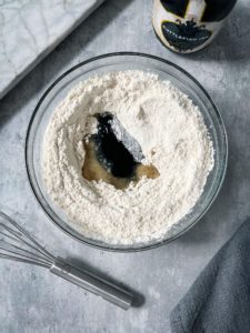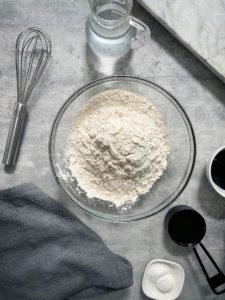 In a large bowl, combine 3 1/4 cups of all purpose flour with 1 teaspoon of salt and 1 teaspoon of baking powder. Once fully incorporated, use your whisk to form a well in the center of the flour mixture…