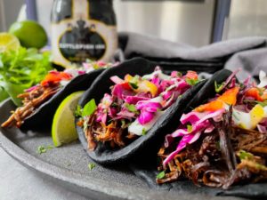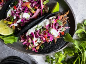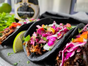 Aren’t they beautiful? I can’t get over that gorgeous inky black color! And although the initial smell of the squid ink is quite strong, once your tortillas are cooked, the flavor is very mild. Today, I filled my squid ink tacos with beef barbacoa and a rainbow chard and purple cabbage citrus slaw. The colors were beautifully contrasting and the flavors were sheer perfection…
