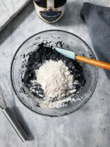 - Form a well in the center of the flour mixture and add 1/3 cup of vegetable oil, 2 tablespoons of squid ink and 1 cup of warm water