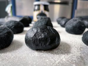 To begin, gather 3 1/4 cups of all-purpose flour (plus more for kneading), 1 teaspoon of salt, 1 teaspoon of baking powder, 1/3 cup of vegetable oil, 2 tablespoons of squid ink and 1 cup of warm water.