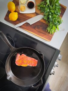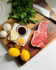 While your steak is relaxing, gather some olive oil, salt, black pepper and steak seasoning for cooking and seasoning the steak. You will also need 4 tablespoons of butter, a tablespoon of soy sauce, a very finely minced clove of garlic, and about a tablespoon of fresh lemon juice for the sauce.