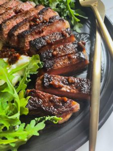 - Slice your rested steak and drizzle with soy butter sauce