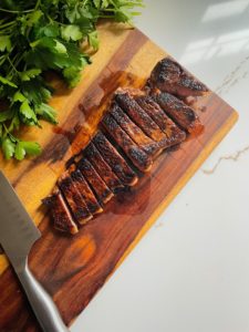 Once your steak is done to your liking, it is very important to allow it to rest for at least 5 minutes before cutting into it. This will give the meat time to relax and the juices time to redistribute, so they stay where they need to be once the steak is sliced. If you cut into a steak too soon after taking it off of the heat, you will notice a whole lot of juices on your cutting board and those juices should be inside your steak not left behind!