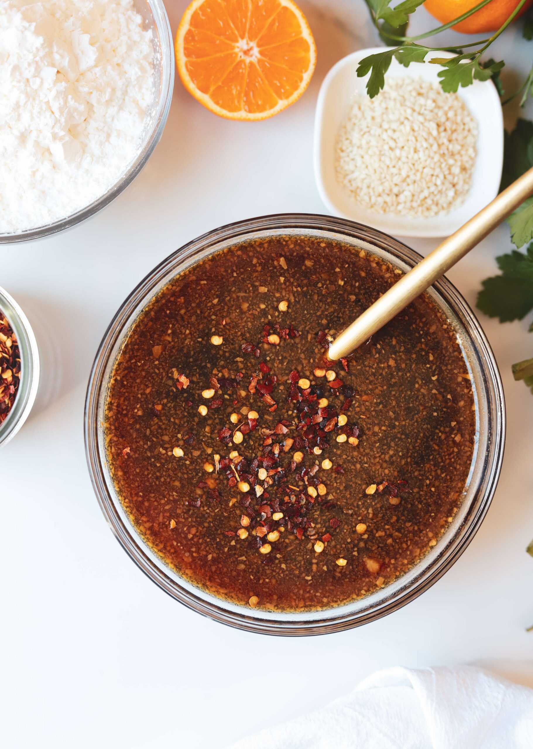 While the chicken is frying, whisk 1/3 cup of honey, 1/3 cup of soy sauce, 1/2 cup of orange juice and 3 tablespoons of rice wine vinegar with 3 cloves of finely minced garlic, 1 tablespoon of pasted or minced ginger and a pinch of red pepper flakes in a small bowl. This is our honey orange sauce and once the chicken is all fried, we are going to add it right into the same skillet to make things easy.