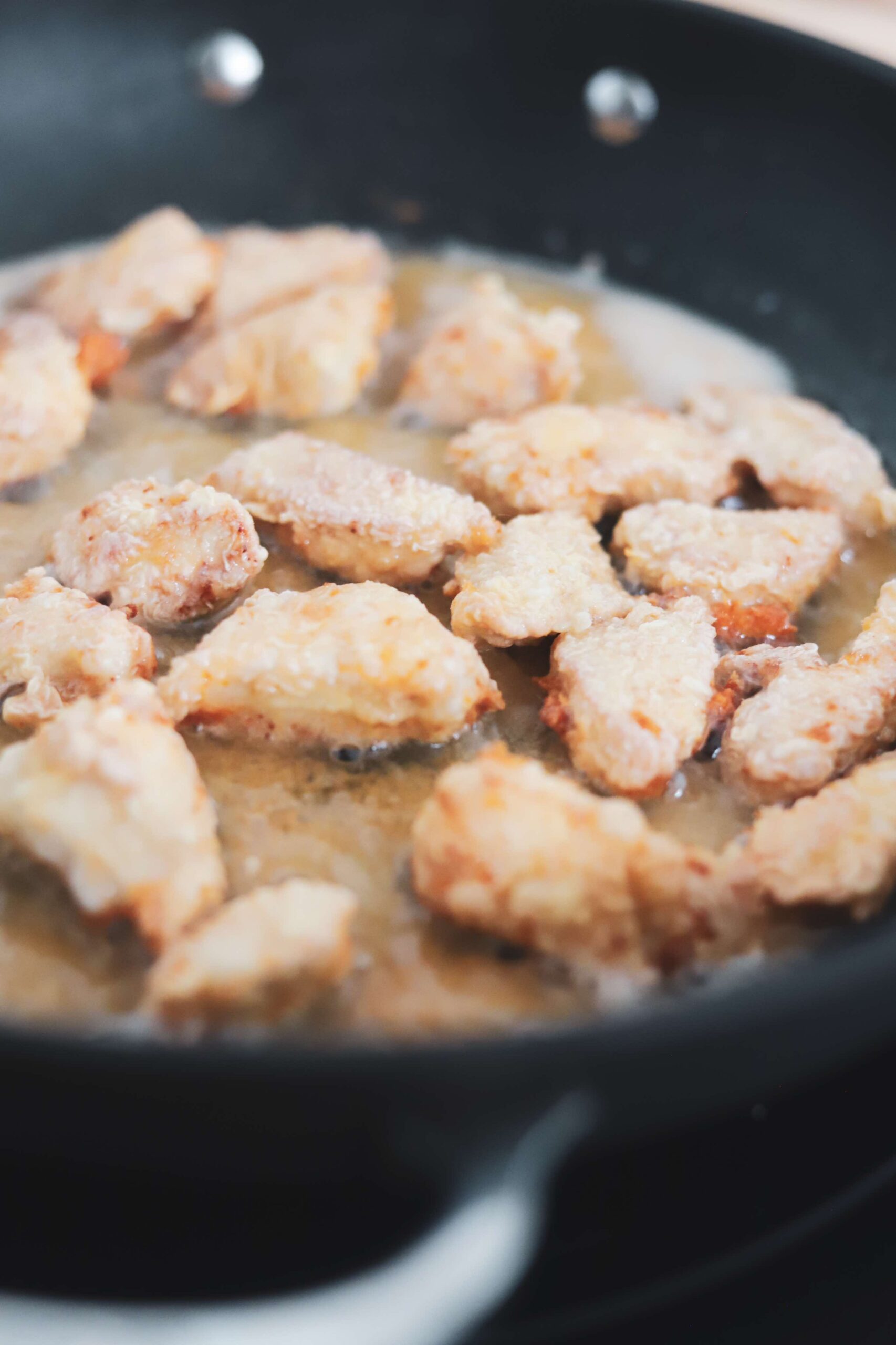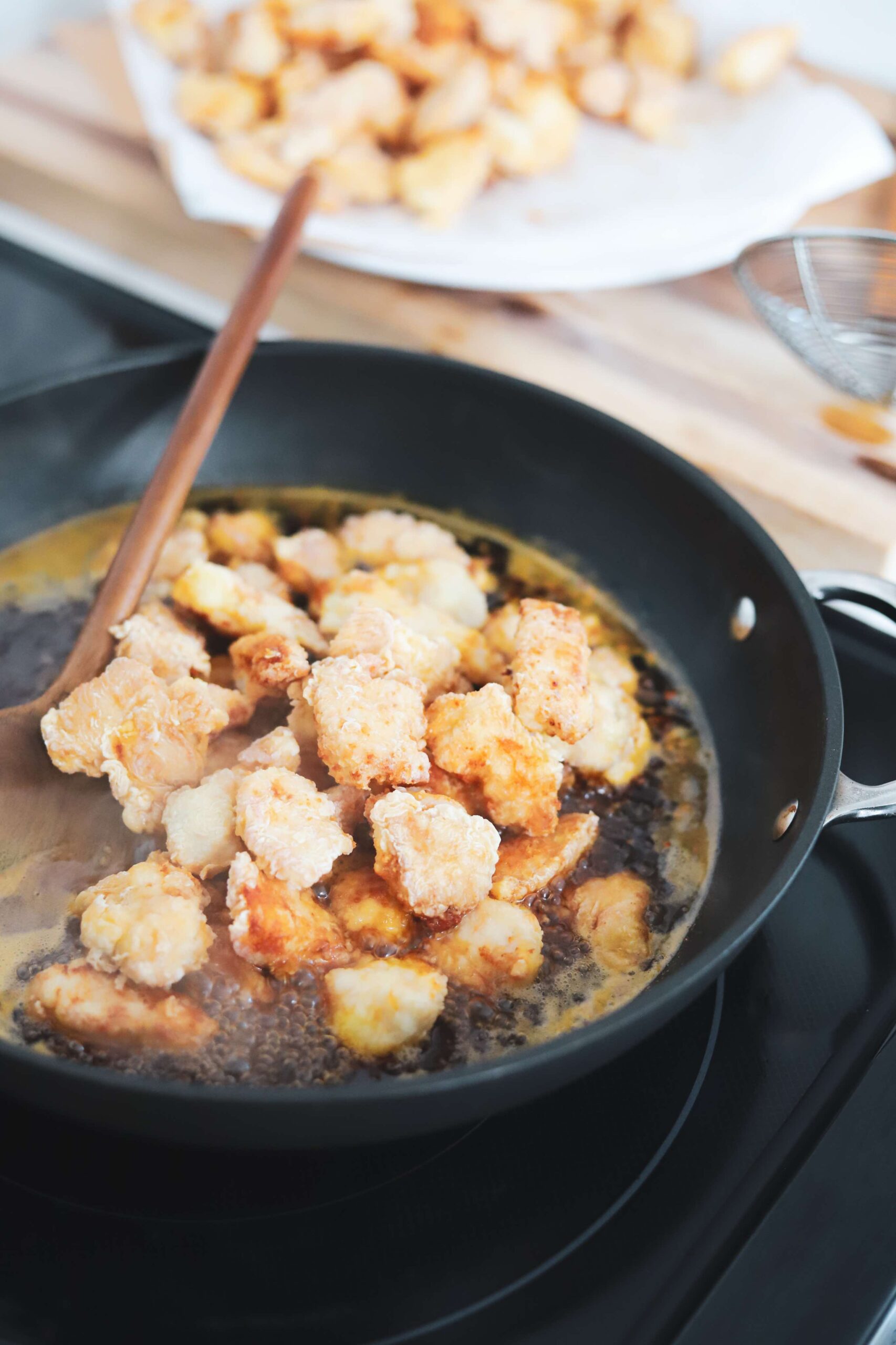 Once all of the chicken is fried and transferred onto a paper towel lined plate, discard the frying oil from the skillet. If you had a lot of burned cornstarch on the bottom of the skillet, very carefully rinse the skillet out to remove those pieces.