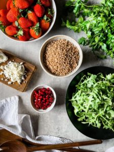 Begin by gathering 3 cups of baby arugula, a small bunch of fresh parsley, 6 ounces of farro, 2 ounces of goat cheese, 1/4 cup of walnuts, 6-8 strawberries and 2 tablespoons of pomegranate arils.