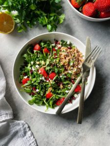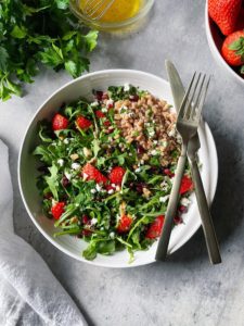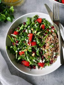 This strawberry, arugula and farro salad is simply fantastic. A bed of crisp, peppery arugula and hearty farro topped with sweet strawberries, salty walnuts and creamy goat cheese creates one truly delicious salad that comes together quick and packs a big punch of flavor.