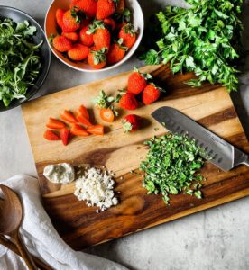 While your farro is cooking, slice your strawberries and walnuts, finely chop your parsley and crumble some goat cheese. This recipe will make two meal sized salads and you can absolutely combine everything in a big bowl, toss it around a bit and divide it between two plates, but if you prefer to arrange your salad as I have in the photos, this is what you’ll do…