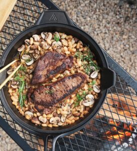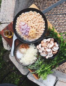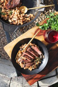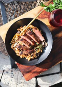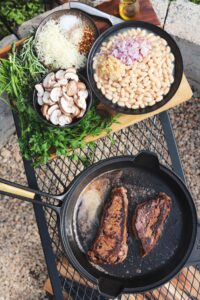 Tonight, we will be grilling a strip steak and making a rich, hearty white bean ragout to pair with it. This dinner for two is rustic and delicious and can be fully cooked and enjoyed around the fire. How romantic is that?