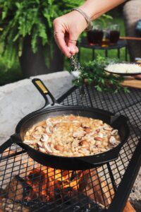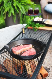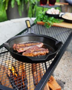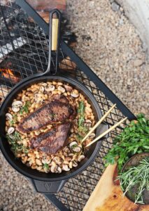 With a cast iron skillet and a firepit, you can grill up a delicious dinner in the beautiful outdoors and that is exactly what we are about to do.
