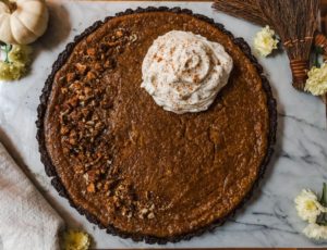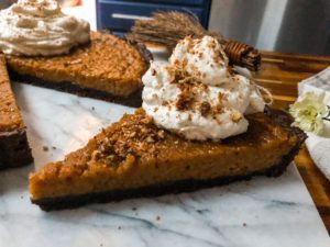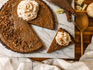 Once you are ready to serve your sweet potato pie, I suggest sprinkling some spiced candied pecans over the top and then adding a big healthy dollop of brown sugar whipped cream.