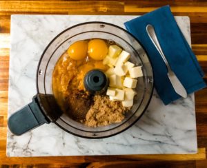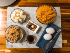 - Combine 8 tablespoons of room temperature unsalted butter, 2 large eggs, 1 tablespoon of vanilla extract, 1/2 teaspoon of cinnamon, 1/4 teaspoon of nutmeg, 1/4 teaspoon of cloves, 1/4 teaspoon of all spice, 1/4 teaspoon of ginger, 1/4 teaspoon of salt, 1 cup of tightly packed light brown sugar and 2 cups of sweet potato puree in a food processor