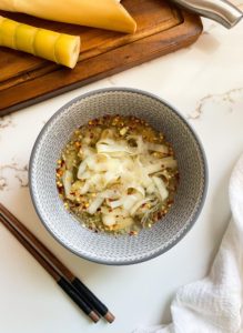 This sweet and sour pickled bamboo is absolutely delicious and adds a beautifully tangy note to anything it is added to. I love it in soup and over a big warm bowl of rice, but it is best served along side sushi either in place of or next to the pickled ginger.