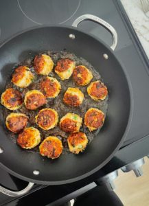 - Once the oil is warm, carefully place the meatballs into the oil and cook until browned and crispy on all sides and cooked through