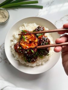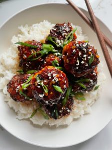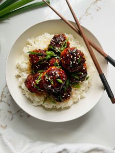 The ginger and chili oil in these meatballs bring a little kick of spice and the glaze has the perfect amount of sweetness to balance the flavors in a wonderful way. The sauce is sticky and luscious with salty, sweet, tangy and umami filled flavors that you are going to absolutely love.
