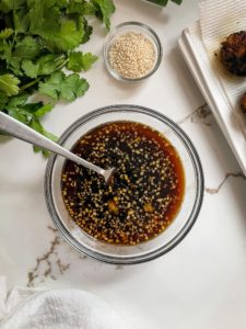 Combine 1/4 cup of rice wine vinegar, 1/4 cup of soy sauce, 1/4 cup of brown sugar, 2 tablespoons of honey, 1 large finely minced garlic clove, 1 teaspoon of grated ginger and a teaspoon of toasted sesame oil in a small bowl.