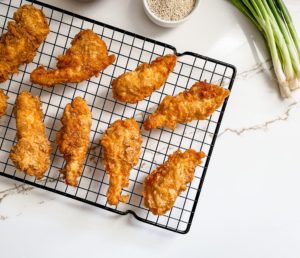 - Fry the tenders for 8-10 minutes or until the internal temperature reaches 165 degrees and then transfer the fried tenders onto a cooling rack and repeat with the remaining tenders