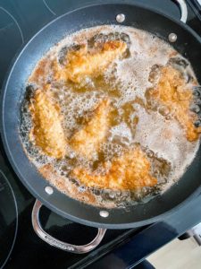 Add about an inch of a neutral oil into a large skillet over medium heat. Let the oil warm until a small piece of flour will sizzle as soon as it is dropped in (about 350 degrees) and then begin frying your tenders.