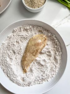 To coat the chicken, dip each lightly floured tender in the egg mixture and then return it back into the flour mixture. Press the breading into each tender to ensure that the entire surface a generously coated.