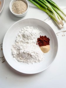 - Whisk 2/3 cup of all purpose flour with 1/3 cup of cornstarch, 1 teaspoon of garlic powder, 1 teaspoon of chili powder and big pinch of salt and black pepper in a shallow bowl