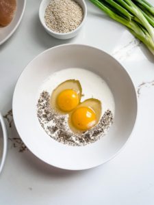 - Whisk 2 large eggs with 2 tablespoons of milk in a separate shallow bowl and season with salt and pepper