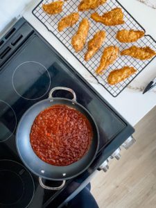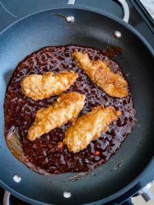 - As soon as the sauce begins to slightly thicken, remove it from the heat and toss the fried tenders in the sauce