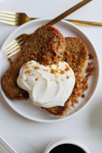 This sweet whipped yogurt is great over banana bread, zucchini bread, olive oil cake… practically any cake really and as a fruit dip too. It is subtly sweet, tangy and wonderfully creamy, so if you are looking for something wonderful to dollop on your desserts then give this sweet whipped yogurt a try!