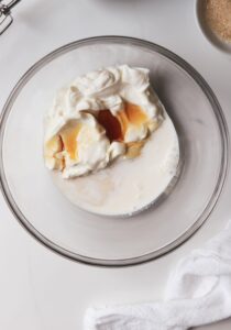 In a mixing bowl, add 3/4 cup of plain greek yogurt (you could use vanilla too!), 2 tablespoons of heavy cream, 1/2 teaspoon of vanilla paste or extract, 1 tablespoon of maple syrup or agave and a pinch of sea salt.