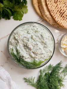- Add the shredded cucumber into a large bowl and add the greek yogurt, minced garlic, dill, mint (if using), lemon juice, olive oil, salt and pepper in a medium bowl