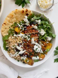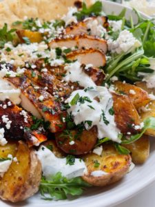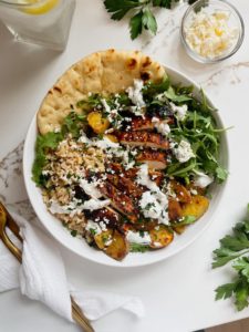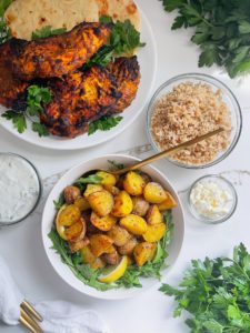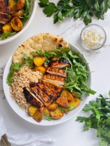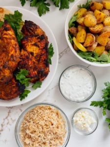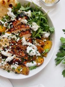 Now that your tandoori chicken is roasted to charred perfection, your rice is fluffy, your potatoes are tender and your feta is crumbled it is time to assemble our bowls.