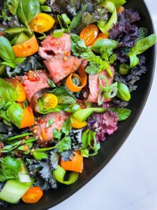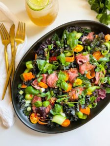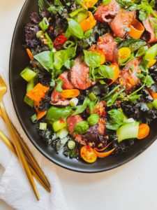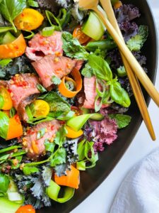 There are so many wonderful things going on in this Thai beef salad. I love the varying textures of the kale, the thinly sliced veggies, the little tomatoes, all of those fresh herbs and of course, the tender beef that was marinaded in the sweet, salty, tangy flavors of the Thai red chili dressing.