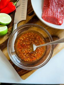 - In a small dish, combine 1 tablespoon of fish sauce, 1 tablespoon of granulated sugar, 2 tablespoons of canola oil, 3 tablespoons of soy sauce, 1/4 cup of fresh lime juice, 2 finely minced cloves of garlic, about 1 teaspoon of grated fresh ginger, 1/2 teaspoon of grated Thai red chili or Birds Eye chilies and 1/2 teaspoon of salt. Whisk vigorously until the sugar has dissolved and all of the ingredients are fully combined. Taste and add additional salt if preferred.