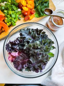Today I am using some gorgeous purple kale from my friends garden and if you love kale like I do, this is a wonderful salad to enjoy it in. If you prefer your kale to be a little more tender then add a splash of olive oil and use your hands to give each leaf a quick massage before tearing it into bite sized pieces and adding it to the salad. Massaging kale helps to tenderize the greens and make it both easier to chew and digest.