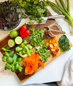 I remove the stems and roughly chop a small bunch of kale or leafy greens. Then, I peel and thinly slice 1/2 of an English cucumber and 1/2 of a carrot and finely chop 1/4 cup of fresh cilantro, 1/4 cup of fresh basil and 1/4 cup of fresh mint. Everything goes into a big bowl along with 1/2 cup of cherry tomatoes, some chopped spring onions and garlic scapes.