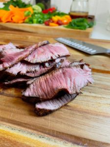Place a cast iron skillet or grill pan over medium heat and add a tablespoon of olive oil. Once the pan is nice and warm, grill your steak to your preferred doneness and then transfer it onto a cutting board to rest for 10 minutes before slicing into thin pieces.