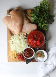 Begin by gathering your ingredients. You will need 3 pounds of boneless skinless chicken (breasts or thighs), some neutral oil, a large white onion, 4 cloves of garlic, some chipotle peppers in adobo sauce, tomato paste, a can of fire roasted tomatoes, cumin, Mexican oregano, salt and black pepper.
