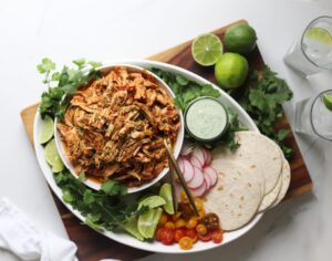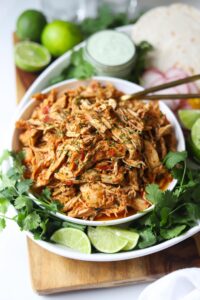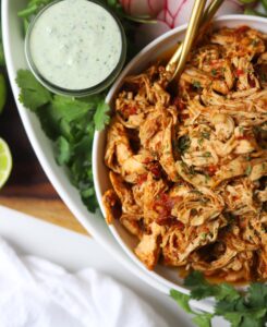 Tinga tacos are one of my favorite ways to enjoy this delicious chicken and instead of your standard sour cream situation, I highly suggest whipping up a batch of my cilantro lime crema to drizzle over each taco.