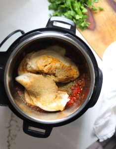 Season your chicken generously with salt and black pepper. Add a few tablespoons of neutral oil into your pressure cooker on sauté mode or into a skillet over medium high heat. Sear the chicken on both sides and then transfer it onto a plate and set it aside for now.