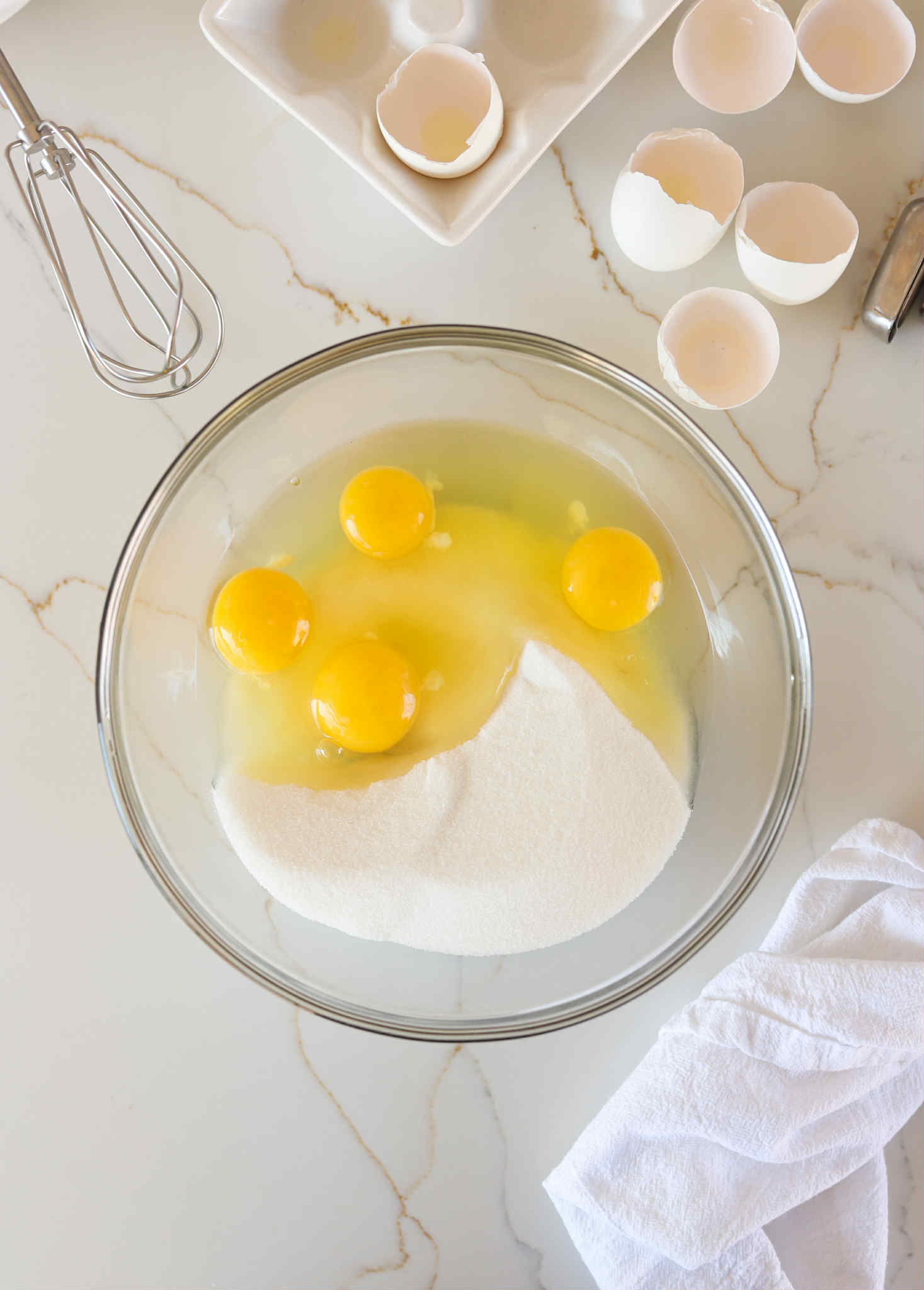 Begin by creaming 4 large eggs with 1 1/2 cups of granulated sugar until it is pale in color and about doubled in volume. While you could do this by hand, this is easiest done with an electric hand mixer on medium to medium high speed for a few minutes.