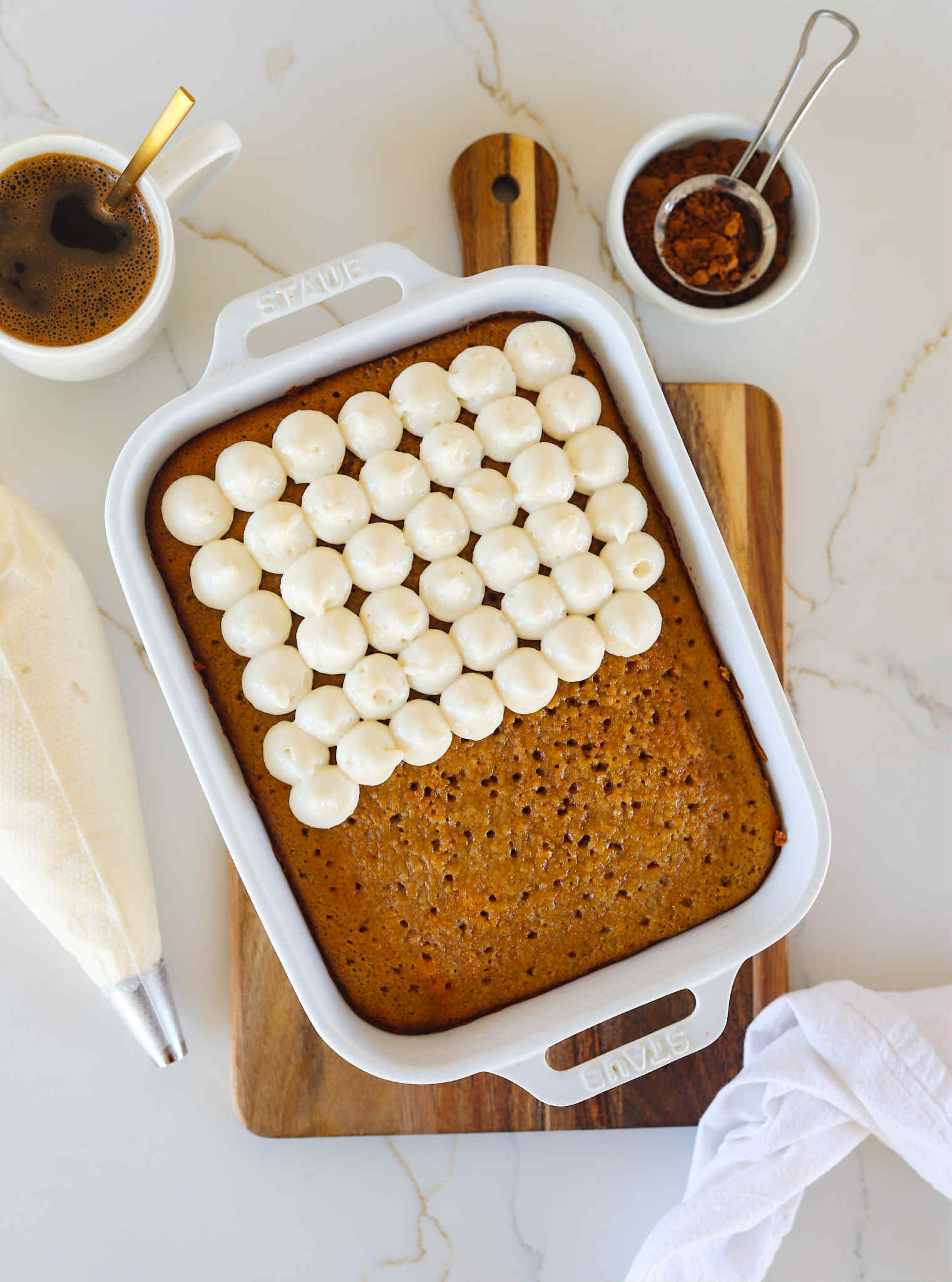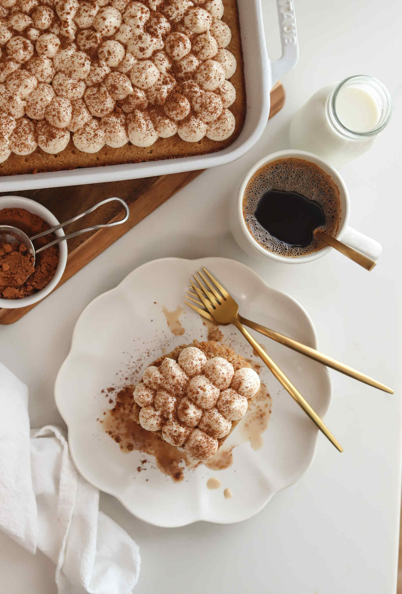 As an Italian girl, I love tiramisu… like, I LOVE tiramisu. I love the soaked lady fingers and that mascarpone cream and while a classic tiramisu isn’t too tough to make, this cake version is even easier and gives all of those beautiful tiramisu vibes.