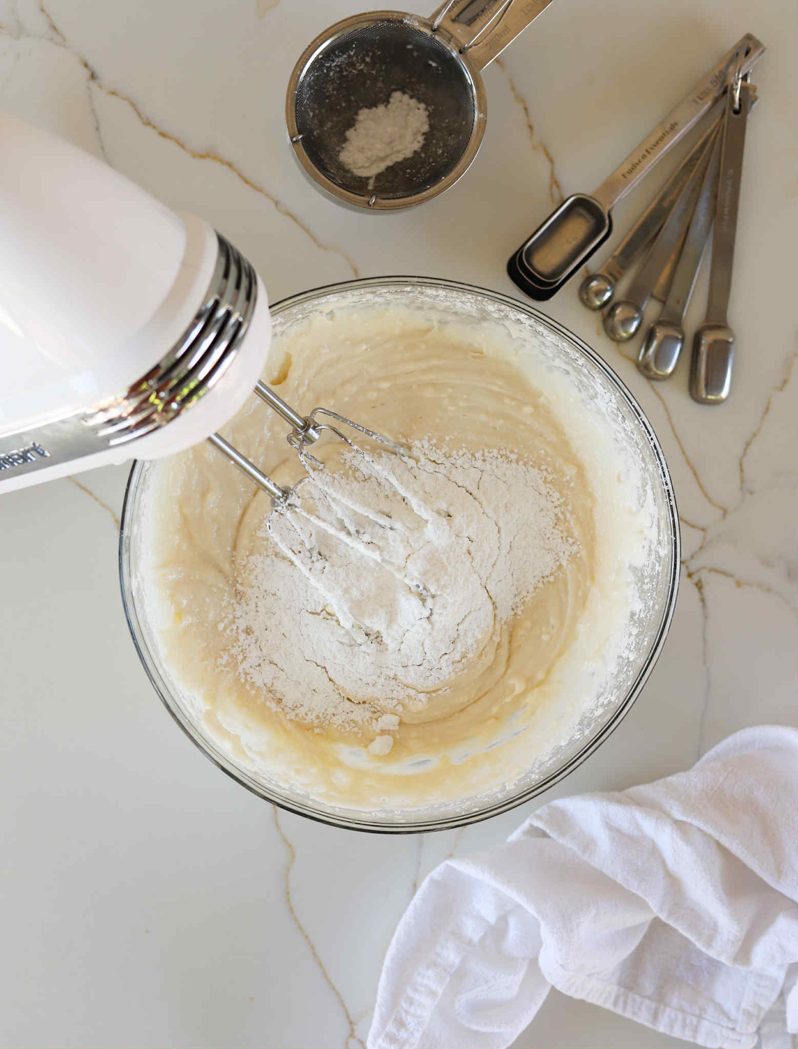 Next, sift 2 cups of all purpose flour, 2 1/2 teaspoons baking powder and 1/2 teaspoon of salt and gently mix until mostly combined. We will be mixing a bit more in a few minutes, so don’t worry about getting everything fully incorporated quite yet.