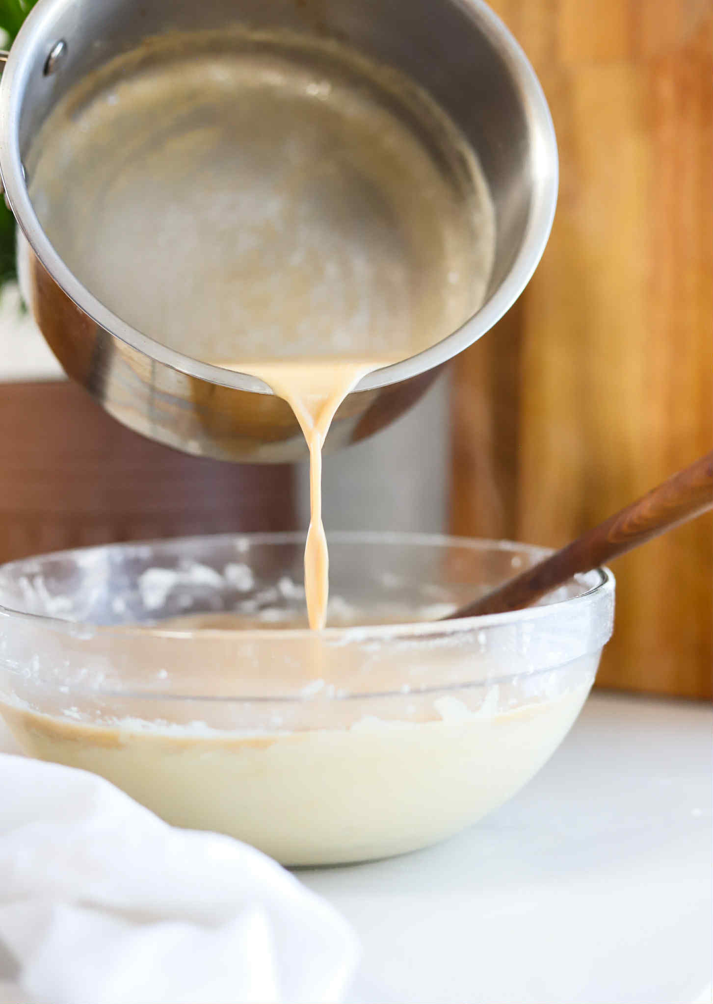 - Add the hot milk mixture into the rest of the batter and mix until fully incorporated