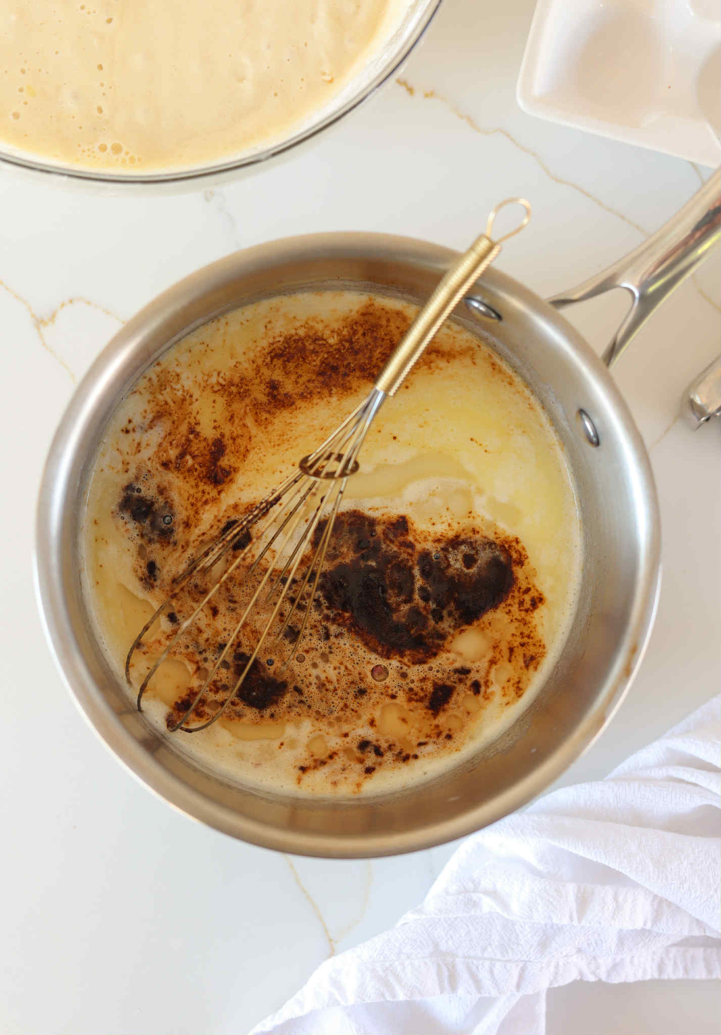 Set the batter aside for now and place a saucepan over medium heat. Add 8 tablespoons of butter and 1 cup of whole milk into the saucepan and heat them up a little. As soon as the butter has melted and the milk starts to steam, transfer the saucepan off of the heat and whisk in 2 teaspoons of pure vanilla extract, a tablespoon of espresso powder and a tablespoon of vegetable oil.