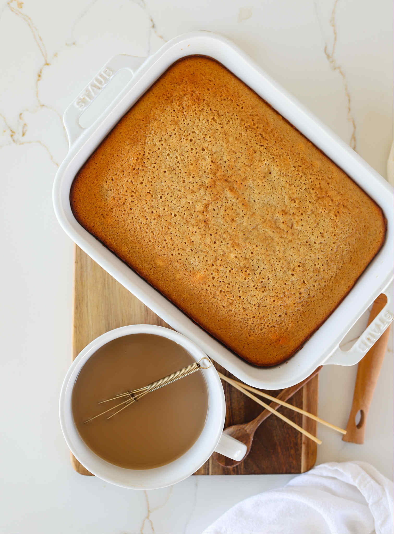 Take a thick toothpick or slim wooden skewer and poke holes all over your vanilla espresso cake and then brush the espresso soak over the entire surface being sure to get around all of the edges.